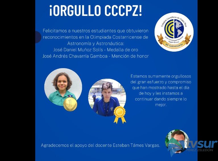 José Daniel Muñoz Solís y José Andrés Chavarría Gamboa, obtuvieron reconocimientos en la Olimpiada Costarricense de Astronomía y Astronáutica; logrando medalla de oro y mención de honor respectivamente.