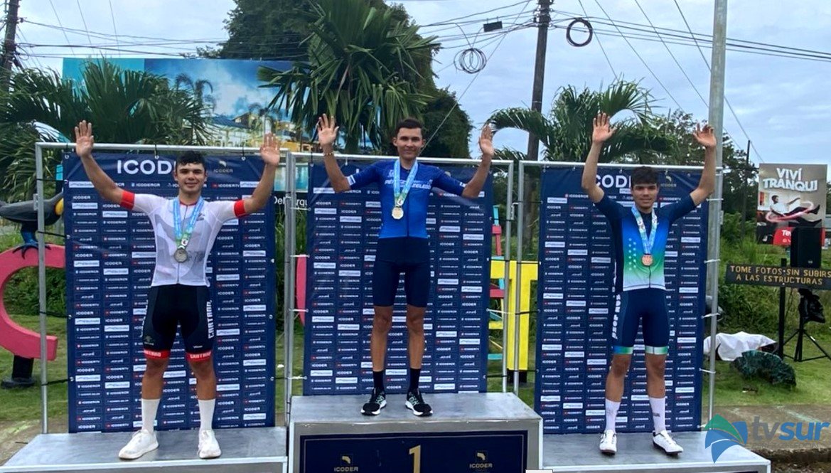 Este fue el momento en que el pedalista generaleño Cristopher Campos cruzo la meta de primero en la prueba de ciclismo de ruta categoría sub 21, en los juegos deportivos nacionales 2026 que se disputan en Limón.