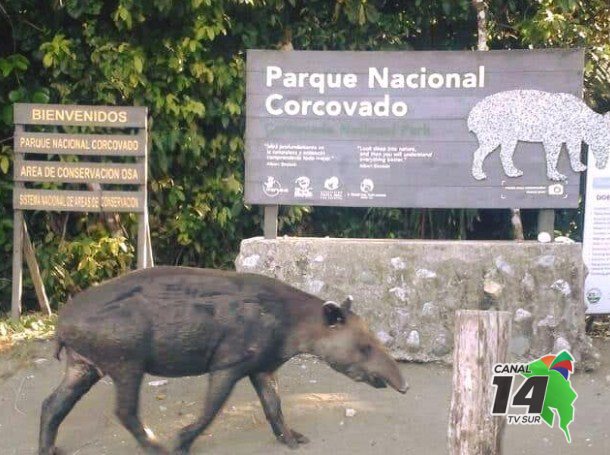 Sin duda, una imagen llamativa que muestra como una danta pasa cerca del rótulo del Parque por la estación Sirena, que por cierto, muestra una imagen de este mamífero y la titulan como: se salió del rótulo.