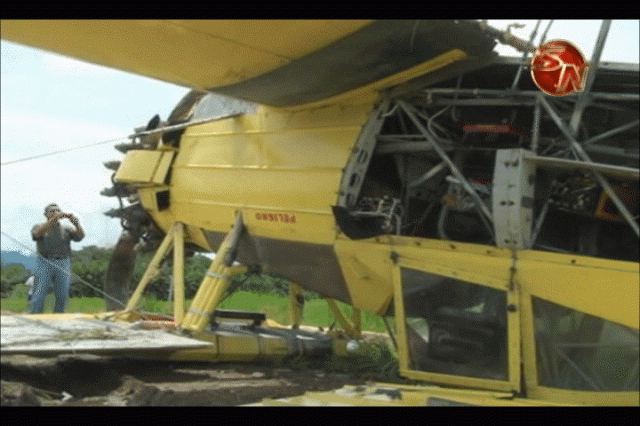 Osa. Después de despegar, esta perdió la potencia, por lo que el piloto identificado como Julio Valerín Piedra de 25 años de edad, realizó varias maniobras para regresar a la pista, pero al ver que le era imposible, descargó el abono foliar que llevaba.